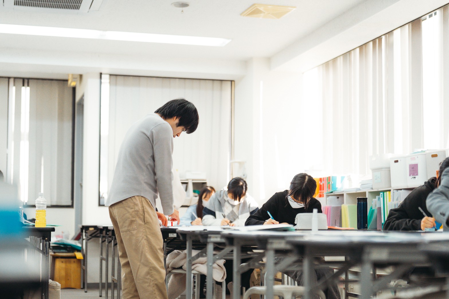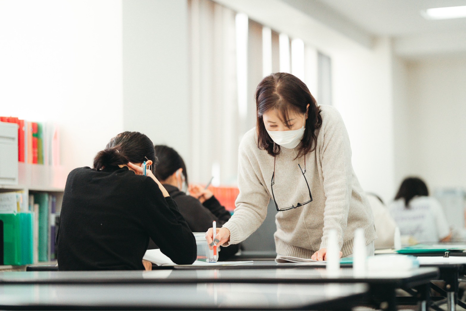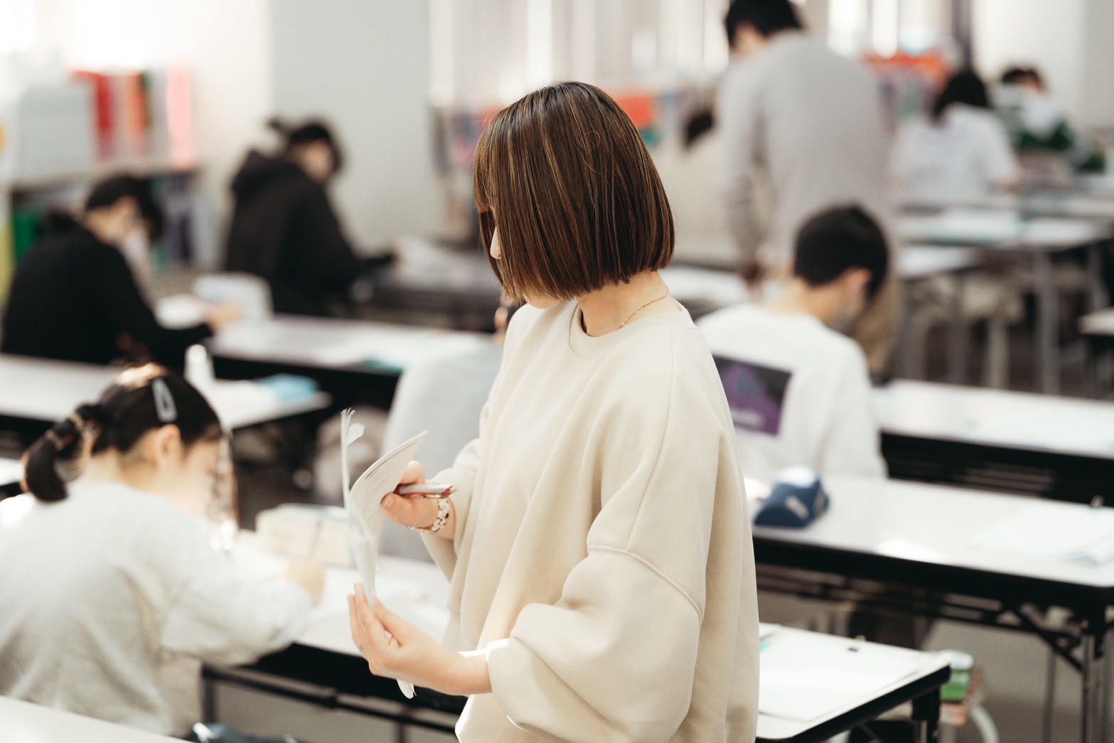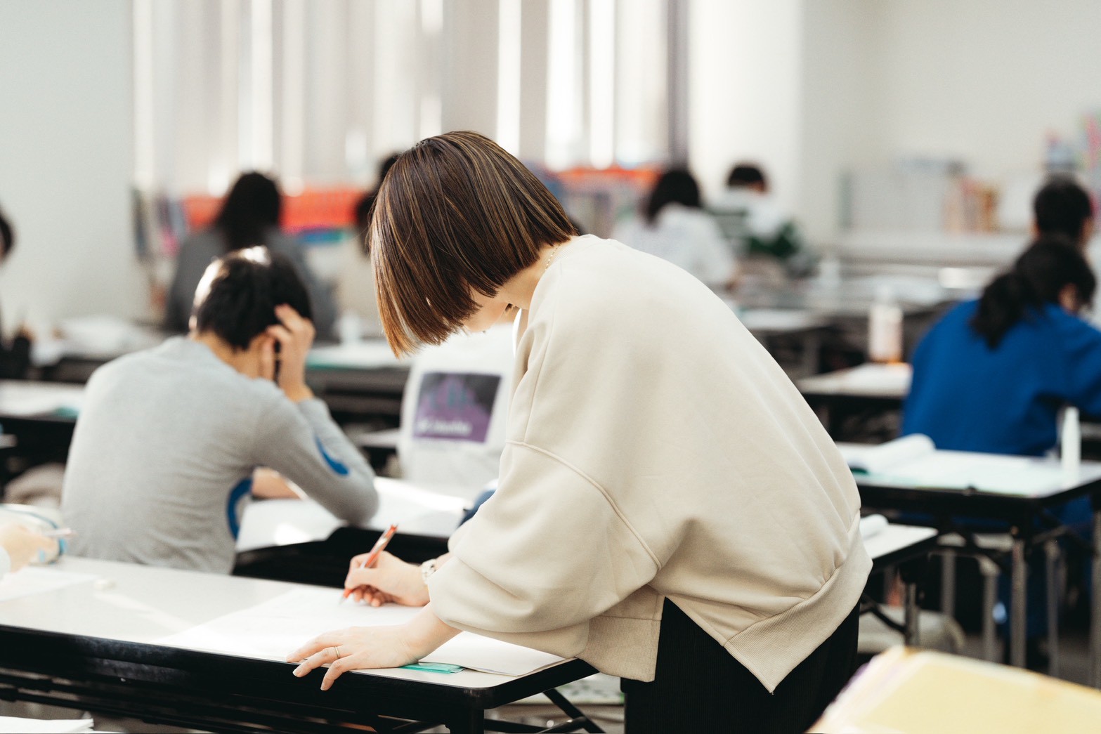 先生が教室を回っています。次々と採点してもらいます、